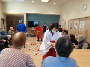 「鬼は外!!」「福は内」の大合唱で、投げる球にも力が入り、福の神様が登場した時には鬼たちも神妙な